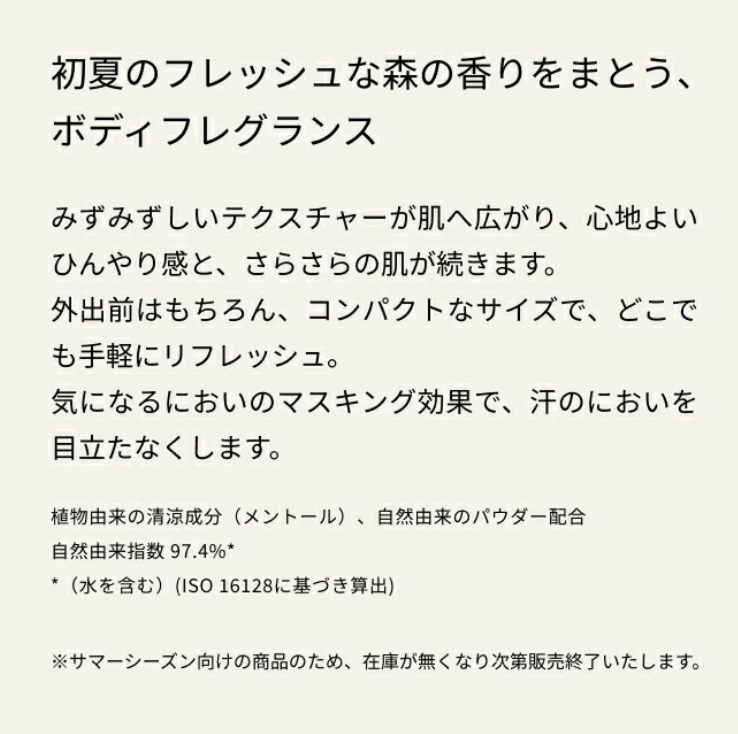 清新的綠意與清澈的水漾香調帶來清爽感受,水潤的質地延展於肌膚,讓肌膚舒適清涼。 蘊含植物清涼成分(薄荷醇)及天然粉末,天然指數高達97.4%* ,可有效遮蓋異味,減少汗漬。