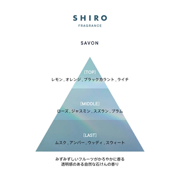 這款香水帶有一種讓人聯想到天然肥皂的「肥皂」香味和淡淡的新鮮水果香味。